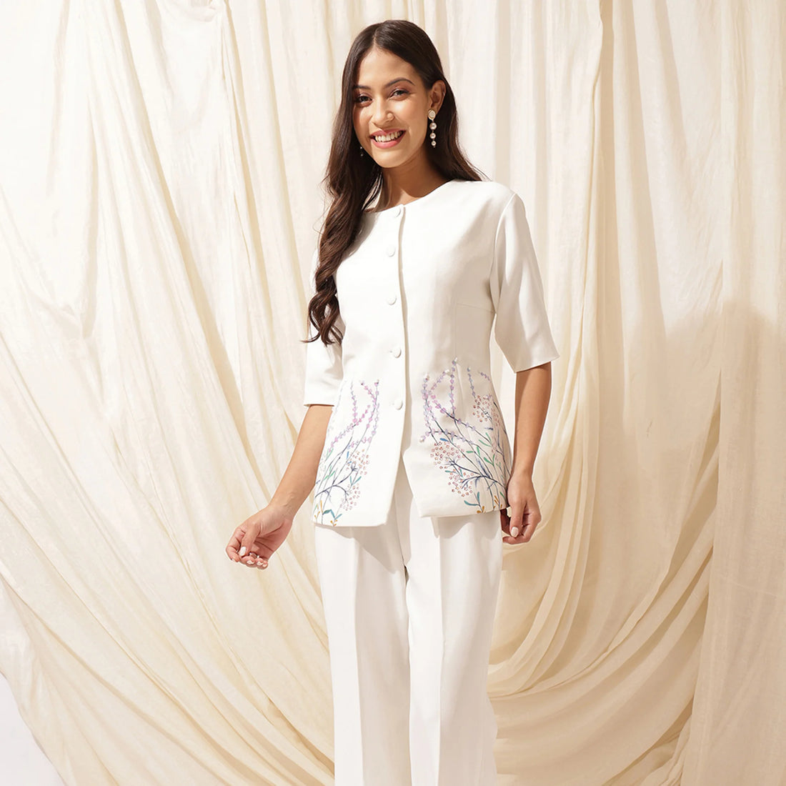 Embrace elegance with this hand-painted white blazer top, adorned with delicate pink and yellow floral...