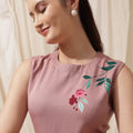 A flowing, pink pleated midi dress with hidden side pockets, enhanced by intricate hand-painted floral detailing. The delicate branches start from the waistline, extending gracefully up to the bodice and all the way down to the bottom, with hand painted soft gradients in the petals and leaves for a realistic, dimensional look. This added detail should bring out a sophisticated, yet lively feel to the dress.