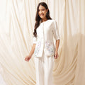 This serene white coord set whispers sophisticated. The top features a structural silhouette with intricate hand-painting of multi-coloured wild flowers caressing the sides of the tailored top along with wide legged white trousers. Made from breathable, lightweight fabric, this ensemble is ideal for summer holidays, outings and formal wear.