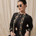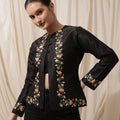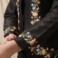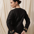This coat is a stunning fusion of tradition and modern tailoring. This sleek black jacket features intricate floral Hand- Painting all over the front including the sleeves in warm pastel tones, adding a touch of artisanal charm to a bold silhouette. The structured design and hook-and-eye closure create a polished, confident look perfect for both festive events and chic evenings out.