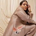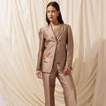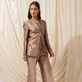 Command the room with this three piece power suit. The sharp lapels, Hand-Painted shaded bird on the side, matching inner and straight-leg trousers bring balance to bold ambition and graceful charm. It is tailored from a premium fabric in a soft taupe hue, this set merges masculine structure with feminine finesse