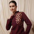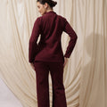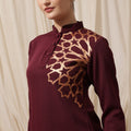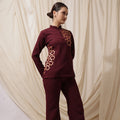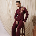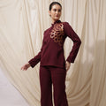 This statement piece is a party must have, which showcases a bold rose gold abstract design on the shoulder and bottom of the top along with pants.