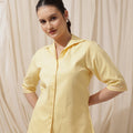 Brighten up your wardrobe with this playful and breezy lemon yellow coord set. Designed for comfort and style, this ensemble incudes a button down shirt with double shaded white and peach Hand Painted abstract line design on the sleeves and on the left bottom of the shorts.
