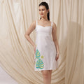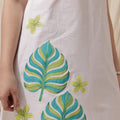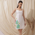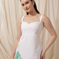 Step into sunshine with this breezy and beautiful white cotton sundress, designed to keep you cool and stylish. Featuring delicate shoulder straps and a softly structured neckline, this dress brings a touch of feminine charm. The highlight is the playful tropical leaf print in shades of green and blue, accented by a subtle yellow flower motif, adding a splash of color and vacation vibes. Ideal for beach days, brunches, or relaxed summer strolls.