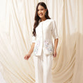 Wide legged white trousers made from breathable, lightweight fabric, this ensemble is ideal for summer holidays, outings and formal wear.